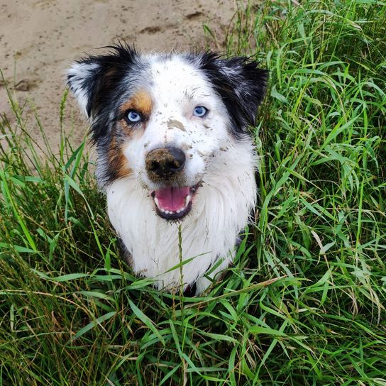 The Australian Shepherd Border Collie mix has a dense, fluffy coat that is mainly gray, with black and white markings. The coat is water repellent and sheds moderately throughout the year.