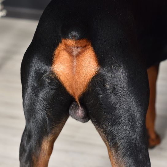 Visto desde atrás, el dóberman parece ancho y redondeado debido a su pronunciada musculatura pélvica en las caderas y la grupa. Los músculos que van desde la pelvis hasta la parte superior e inferior de los muslos dan lugar a un buen desarrollo de la anchura también en la zona de los muslos, la rodilla y la parte inferior del muslo.
