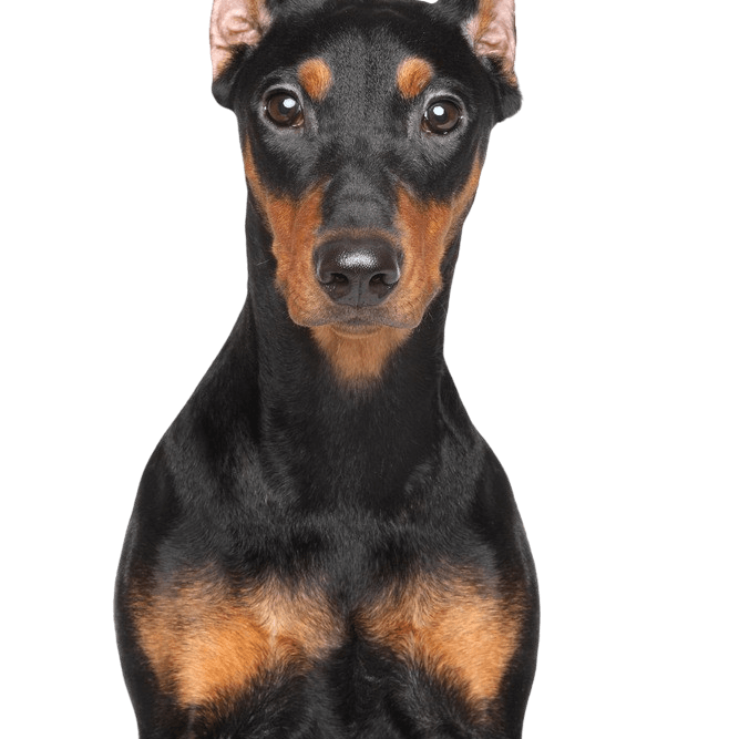 El lenguaje corporal del pinscher alemán se describe mejor como orgulloso y elegante. Su cuerpo, fuerte y musculoso, se pone a tono con cada movimiento. También son típicas de la raza las orejas altas e inclinadas hacia delante en forma de V. Los bordes interiores se apoyan en las mejillas.