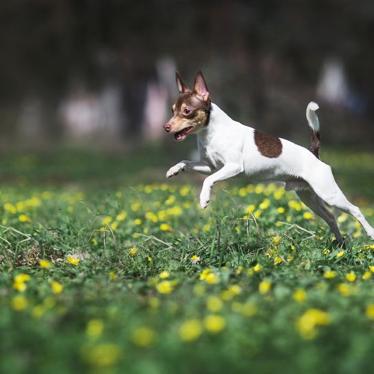 El Toy Fox Ter rier es una raza de perro pequeña pero extremadamente vivaz que se desarrolló originalmente en EE UU. Se crió deliberadamente más pequeño a partir del Smooth Fox Terrier, incluyendo cruces con el Chihuahua, el Galgo Italiano y el Pinscher Miniatura, para crear un perro de compañía compacto, inteligente y versátil. La raza está reconocida oficialmente por el American Kennel Club (AKC) y figura en su lista de Razas de Juguete.